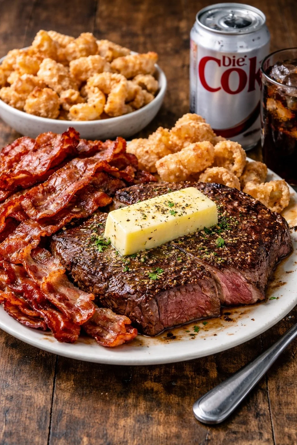 Hey, this is low carb….but I would not recommend this kind of food more than once a year….Steak with butter on top, pork rinds, diet coke, and bacon.