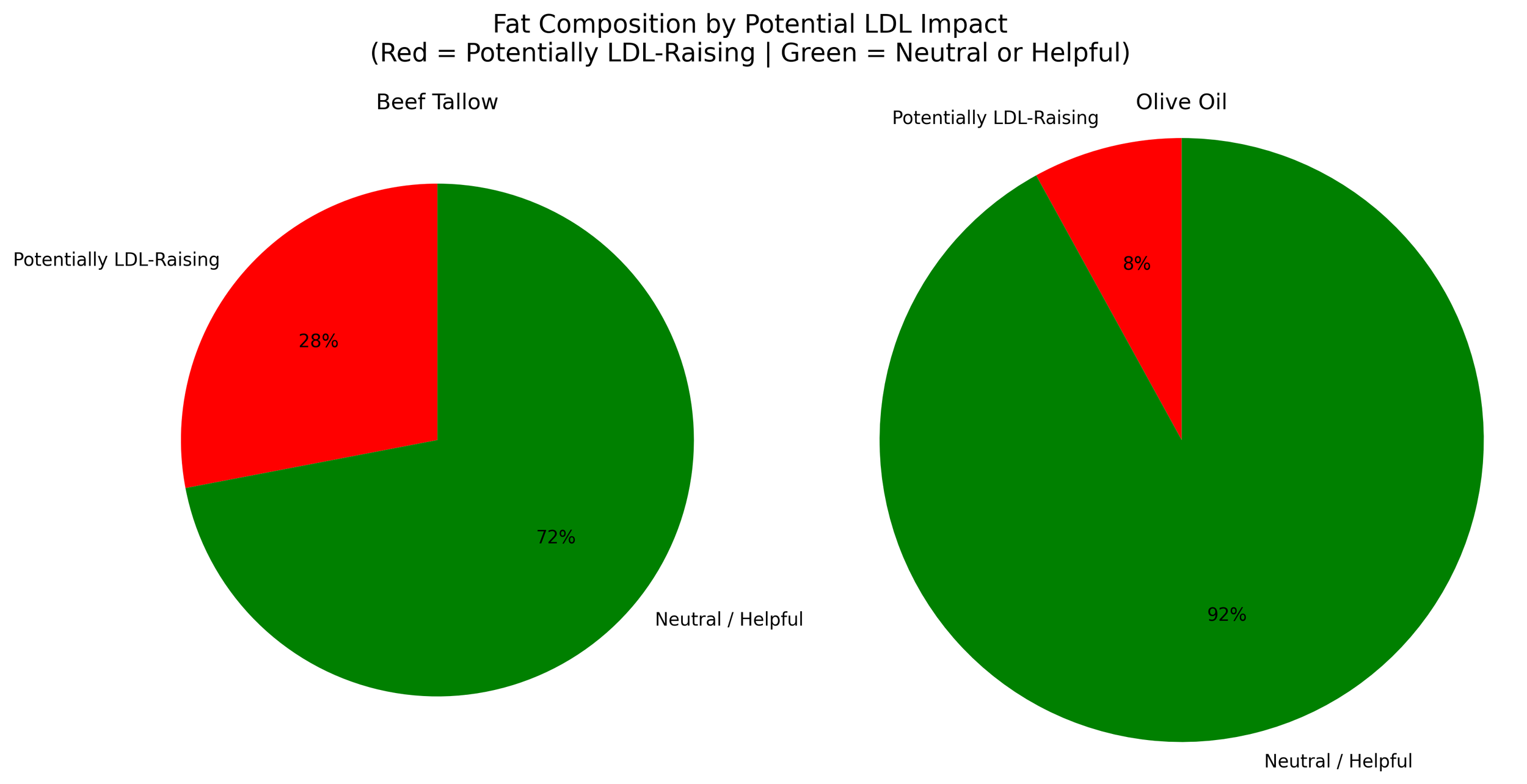 Now, what makes this more interesting is this: of the saturated fat content in beef tallow, only around 25-30% of it is of concern for actually raising cholesterol (which can contribute to heart disease). This component of saturated fat is called palmitic acid (25–30%). The rest of the saturated fat in beef tallow is stearic acid (15-20%), which does NOT raise cholesterol. The rest of the overall fat content is oleic acid ( the same as olive oil).