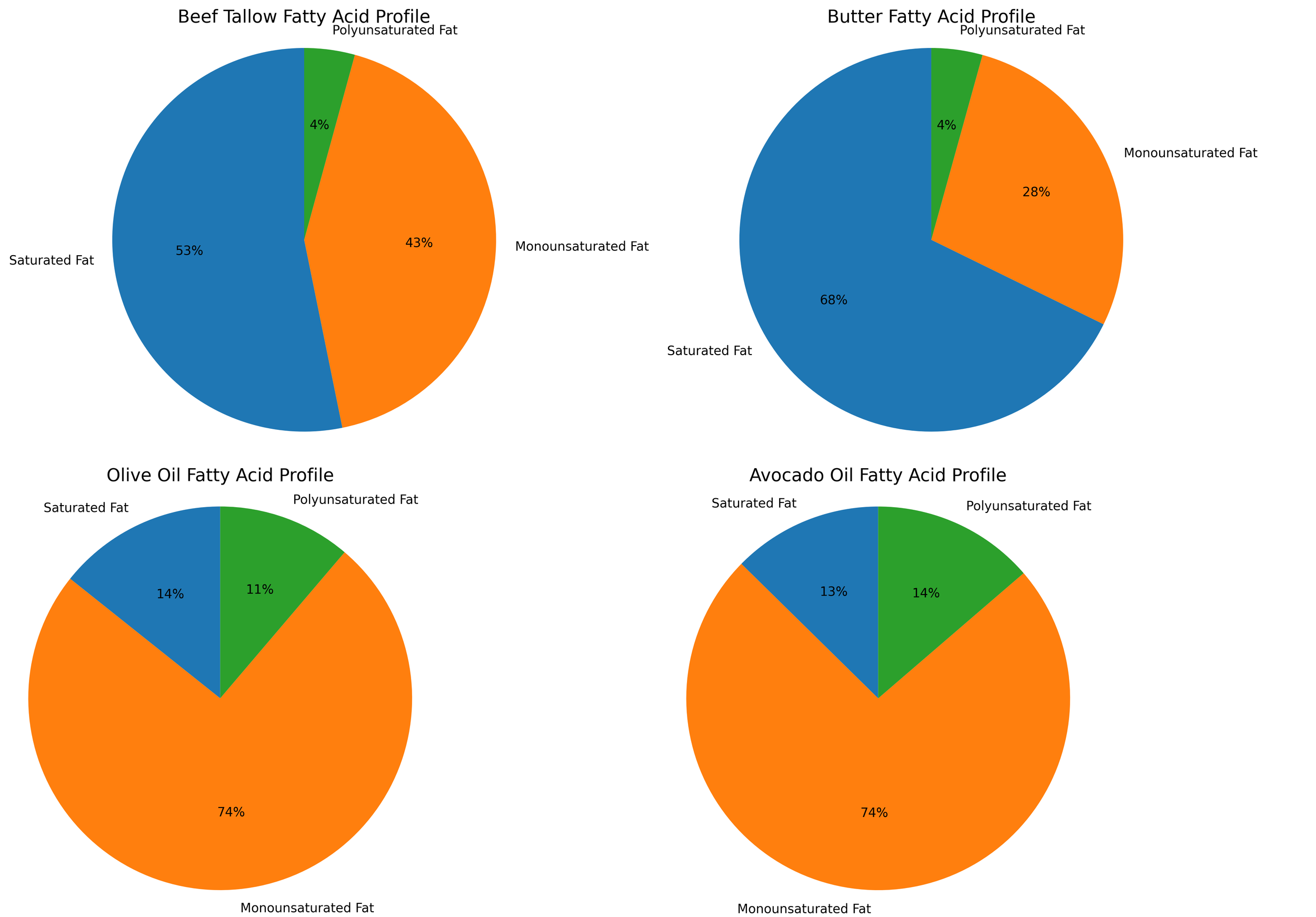 Before shutting the book on this topic, I did get curious. What exactly is the make-up of BEEF TALLOW compared to other fat sources? I was somewhat surprised. Check out the compare and contract chart below.